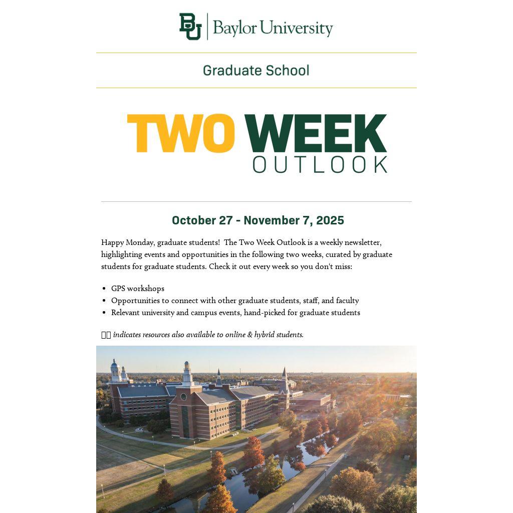 Happy Monday, graduate students! The Two Week Outlook is a weekly newsletter, highlighting events and opportunities in the following two weeks, curated by graduate students for graduate students. Check it out every week so you don't miss:
