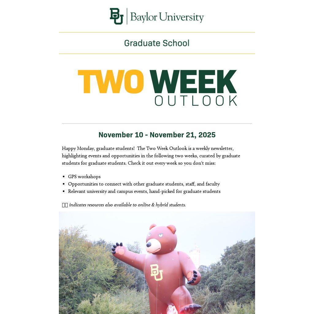 Happy Monday, graduate students! Â The Two Week Outlook is a weekly newsletter, highlighting events and opportunities in the following two weeks, curated by graduate students for graduate students. Check it out every week so you don't miss: