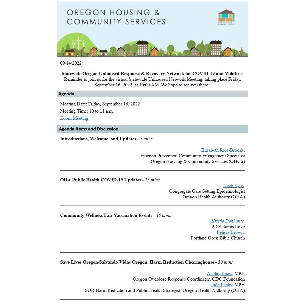 Reminder to join us for the virtual Statewide Unhoused Network Meeting, taking place Friday, September 16, 2022, at 10:00 AM. We hope to see you there!