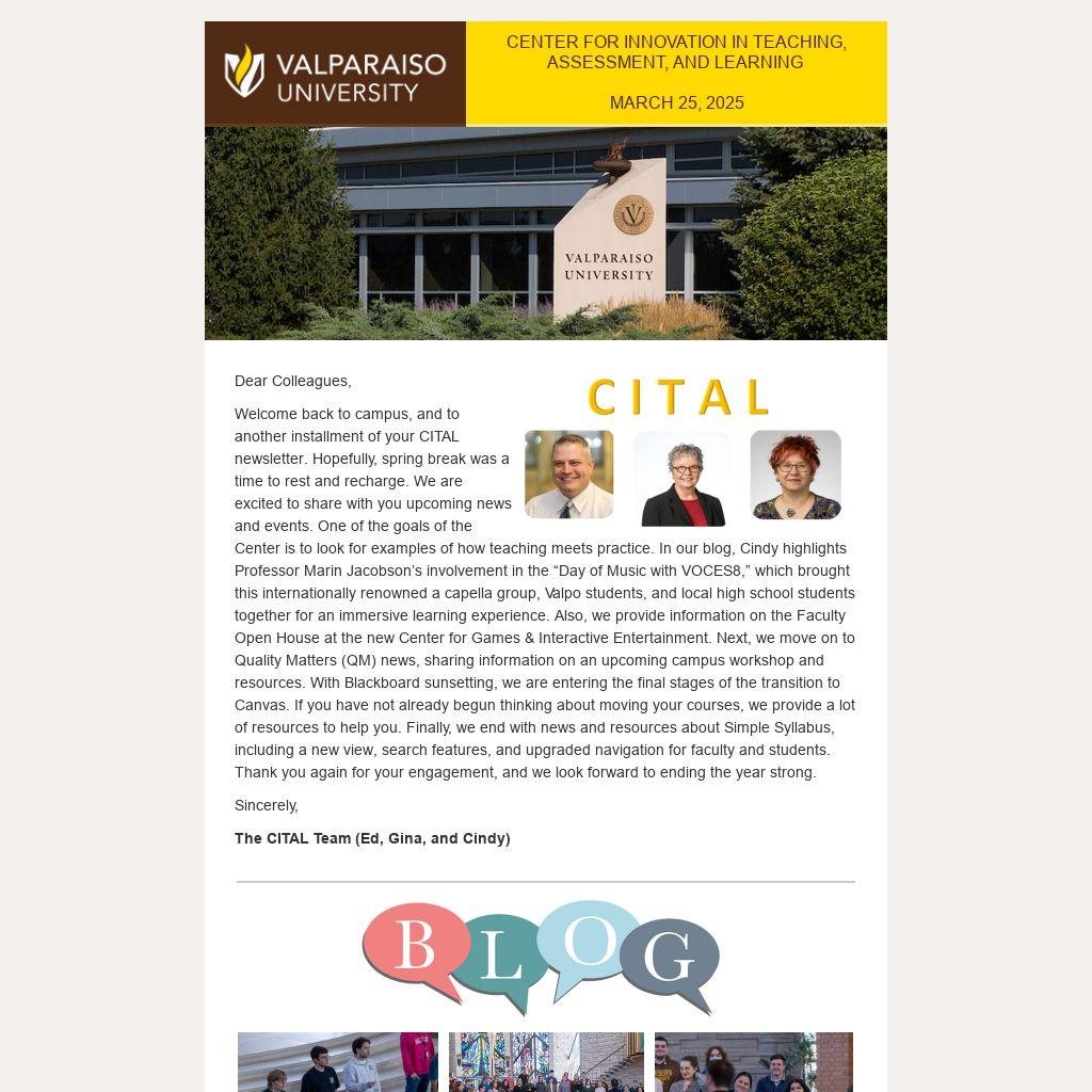 Welcome back to campus, and to another installment of your CITAL newsletter. Hopefully, spring break was a time to rest and recharge. We are excited to share with you upcoming news and events. One of the goals of the Center is to look for examples of how teaching meets practice. In our blog, Cindy highlights Professor Marin Jacobson’s involvement in the “Day of Music with VOCES8,” which brought this internationally renowned a capella group, Valpo students, and local high school students together for an immersive learning experience. Also, we provide information on the Faculty Open House at the new Center for Games & Interactive Entertainment. Next, we move on to Quality Matters (QM) news, sharing information on an upcoming campus workshop and resources. With Blackboard sunsetting, we are entering the final stages of the transition to Canvas. If you have not already begun thinking about moving your courses, we provide a lot of resources to help you. Finally, we end with news and resources about Simple Syllabus, including a new view, search features, and upgraded navigation for faculty and students. Thank you again for your engagement, and we look forward to ending the year strong.