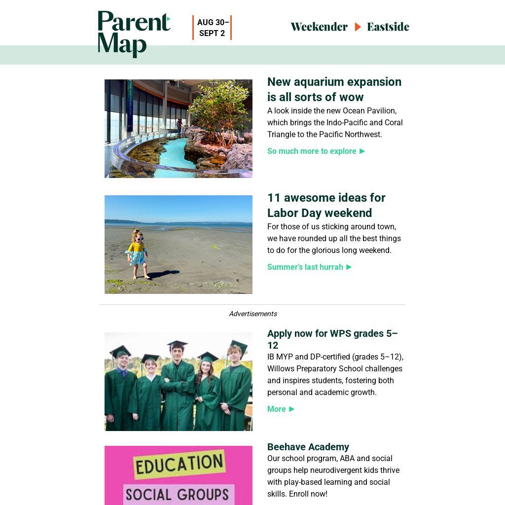 Happy Labor Day weekend! As summer comes to an end, soak up the rays of sunshine while you still can with these awesome Labor Day plans or my top 10 calendar events. And donât miss out on the opening weekend of the Washington State Fair, or the brand-new Ocean Pavilion, open now at the Seattle Aquarium. One last way to stretch out summer? Pack your swimsuit for a romp at this weekâs adventurous playground of the week â it has a brand-new splash pad.