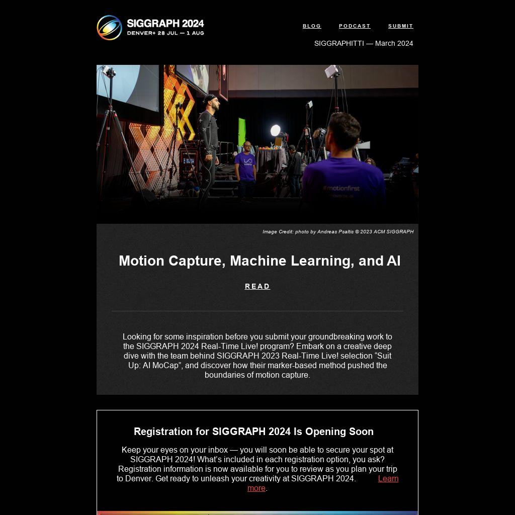 Keep your eyes on your inbox — you will soon be able to secure your spot at SIGGRAPH 2024! What’s included in each registration option, you ask? Registration information is now available for you to review as you plan your trip to Denver. Get ready to unleash your creativity at SIGGRAPH 2024. Learn more.