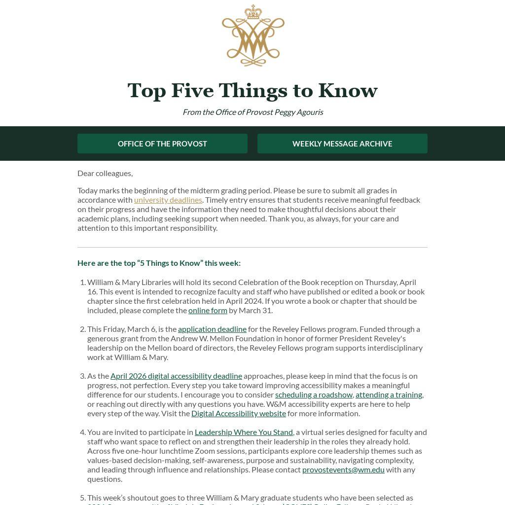 As the April 2026 digital accessibility deadline approaches, please keep in mind that the focus is on progress, not perfection. Every step you take toward improving accessibility makes a meaningful difference for our students. I encourage you to consider scheduling a roadshow, attending a training, or reaching out directly with any questions you have. W&M accessibility experts are here to help every step of the way. Visit the Digital Accessibility website for more information.