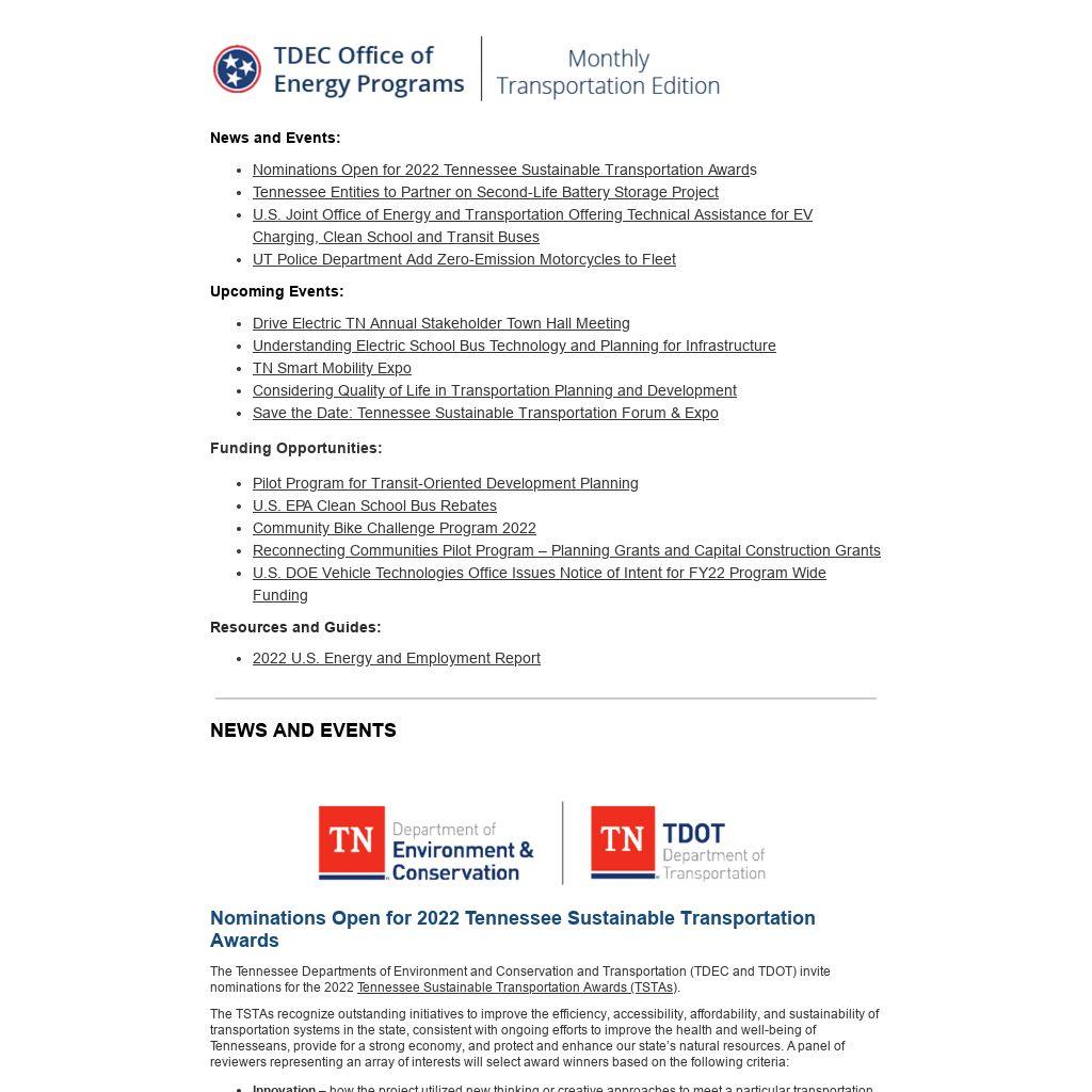 | Nominations Open for 2022 Tennessee Sustainable Transportation Awards