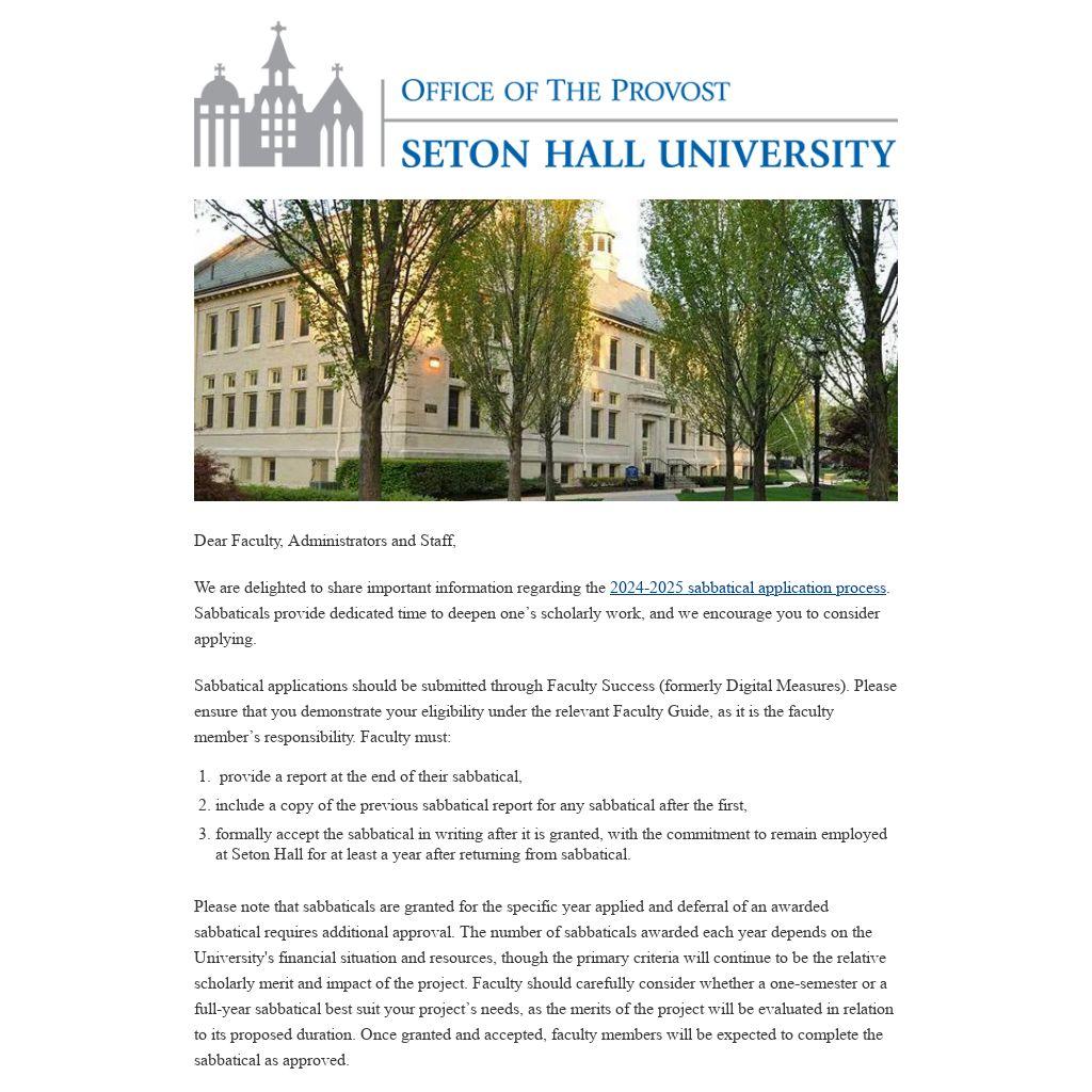 We are delighted to share important information regarding the 2024-2025 sabbatical application process. Sabbaticals provide dedicated time to deepen one’s scholarly work, and we encourage you to consider applying.