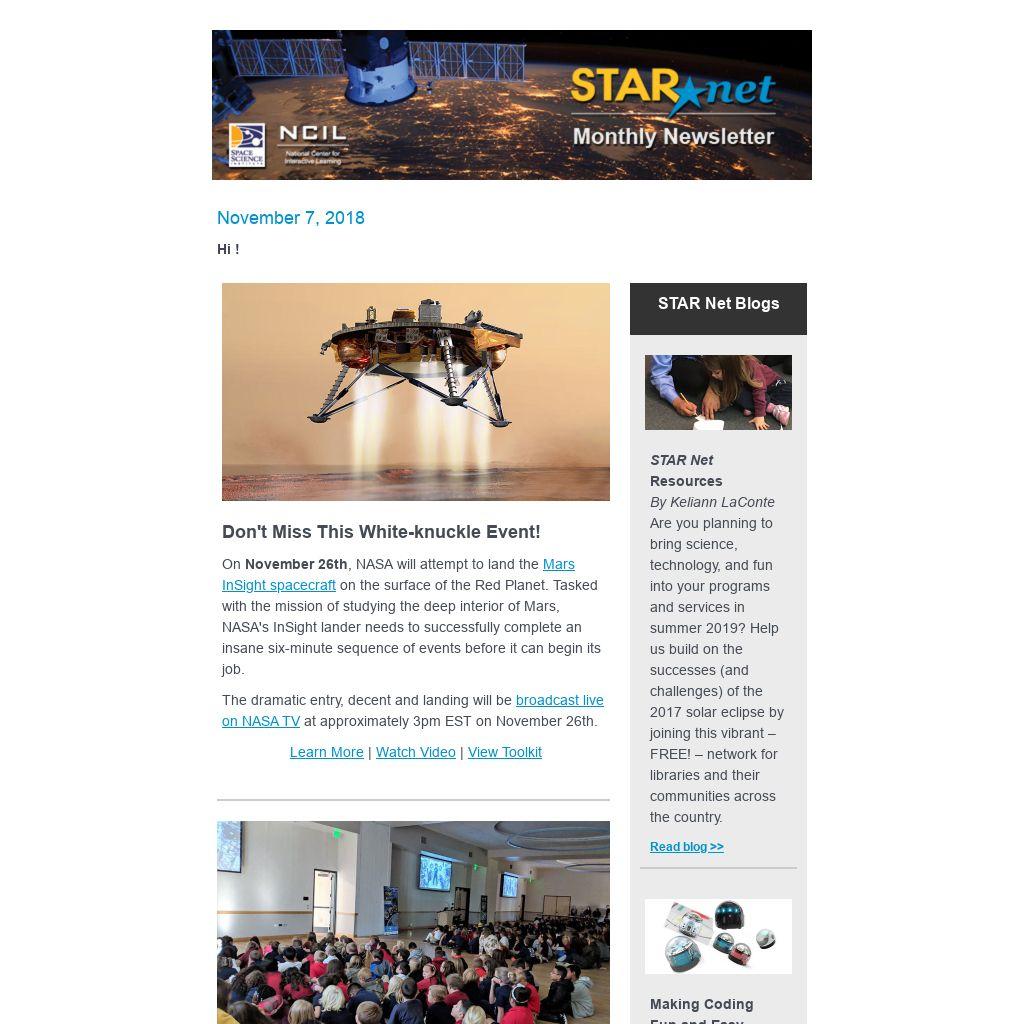 Note: During the month of November, we'll be highlighting some important past webinars. On May 5, InSight began its six-month journey from the coast of California to the plains of Mars. Once it lands on November 26th, it will use seismic instruments to explore the interior of Mars in ways that we’ve never “seen” before! Join the STAR Net team and guest presenter Steve Lee (Denver Museum of Nature and Science and Space Science Institute) to learn all about this exciting, innovative mission and fun ways to celebrate its landing at your library!