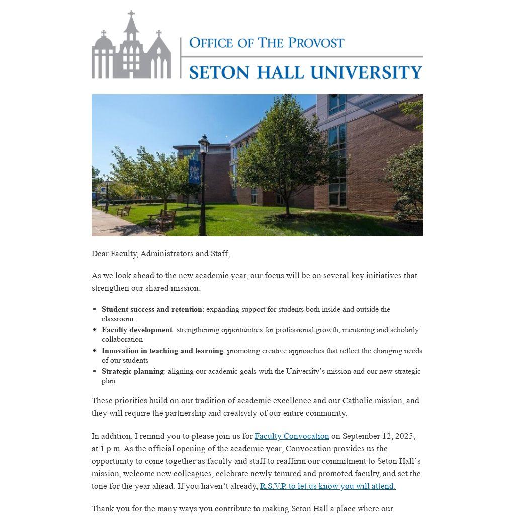 In addition, I remind you to please join us for Faculty Convocation on September 12, 2025, at 1 p.m. As the official opening of the academic year, Convocation provides us the opportunity to come together as faculty and staff to reaffirm our commitment to Seton Hall’s mission, welcome new colleagues, celebrate newly tenured and promoted faculty, and set the tone for the year ahead. If you haven’t already, R.S.V.P. to let us know you will attend.