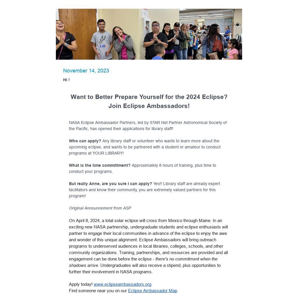 NASA Eclipse Ambassador Partners, led by STAR Net Partner Astronomical Society of the Pacific, has opened their applications for library staff!