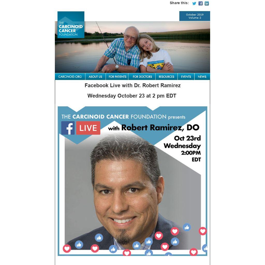 Join us tomorrow, October 23rd at 2 PM EDT, for a special Facebook Live Event with neuroendocrine tumor (NET) expert Dr. Robert Ramirez for an in-depth discussion about Lung Neuroendocrine Tumors and DIPNECH. We hope to see you there!