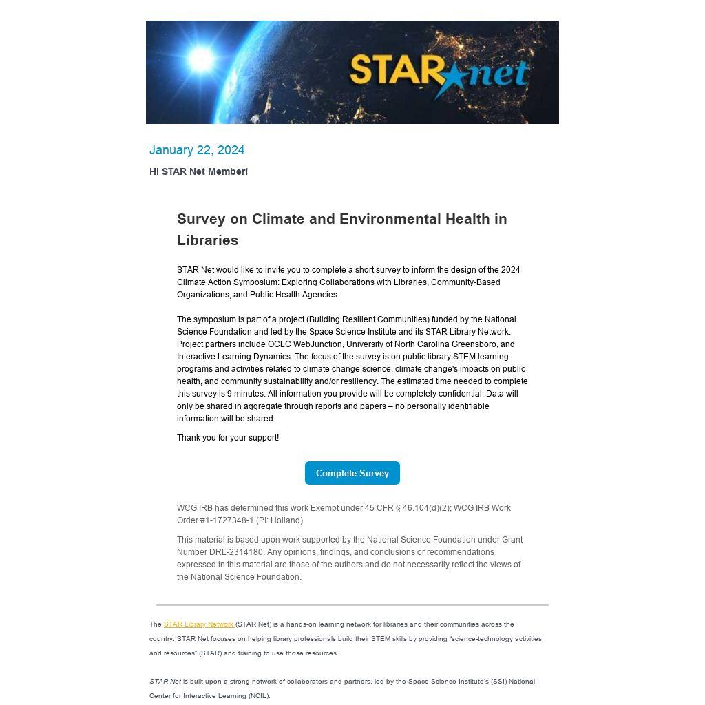STAR Net would like to invite you to complete a short survey to inform the design of the 2024 Climate Action Symposium: Exploring Collaborations with Libraries, Community-Based Organizations, and Public Health Agencies