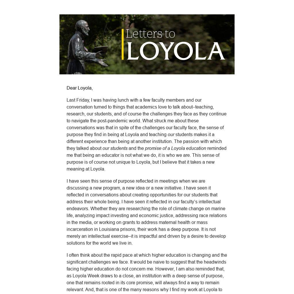 I often think about the rapid pace at which higher education is changing and the significant challenges we face. It would be naive to suggest that the headwinds facing higher education do not concern me. However, I am also reminded that, as Loyola Week draws to a close, an institution with a deep sense of purpose, one that remains rooted in its core promise, will always find a way to remain relevant. And, that is one of the many reasons why I find my work at Loyola to be purposeful.