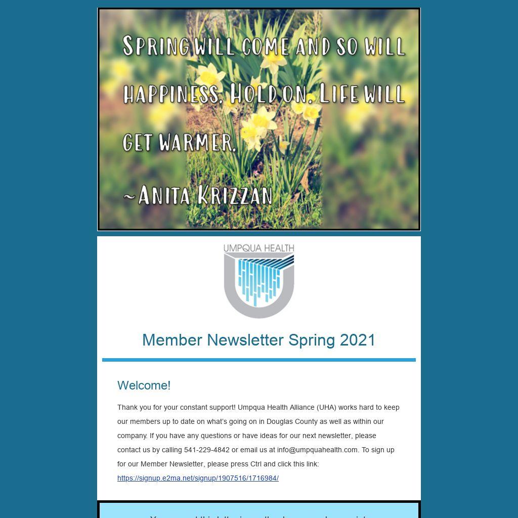 Thank you for your constant support! Umpqua Health Alliance (UHA) works hard to keep our members up to date on what’s going on in Douglas County as well as within our company. If you have any questions or have ideas for our next newsletter, please contact us by calling 541-229-4842 or email us at info@umpquahealth.com. To sign up for our Member Newsletter, please press Ctrl and click this link: https://signup.e2ma.net/signup/1907516/1716984/