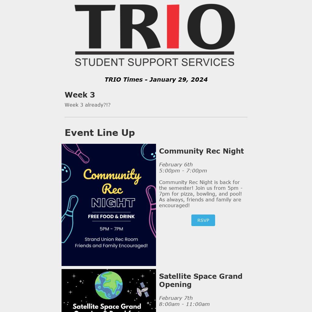 Community Rec Night is back for the semester! Join us from 5pm - 7pm for pizza, bowling, and pool! As always, friends and family are encouraged!