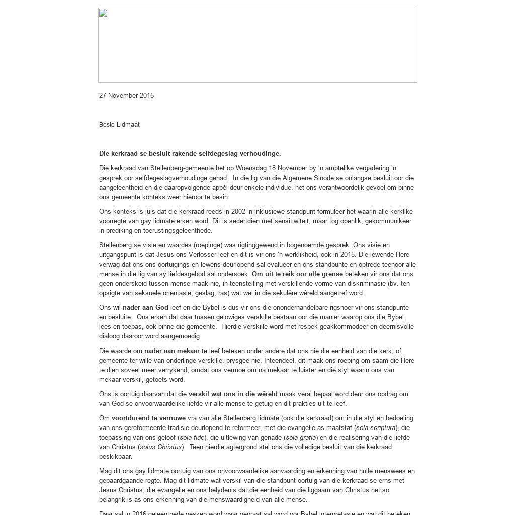 Die kerkraad van Stellenberg-gemeente het op Woensdag 18 November by ’n amptelike vergadering ’n gesprek oor selfdegeslagverhoudinge gehad. In die lig van die Algemene Sinode se onlangse besluit oor die aangeleentheid en die daaropvolgende appèl deur enkele individue, het ons verantwoordelik gevoel om binne ons gemeente konteks weer hieroor te besin.