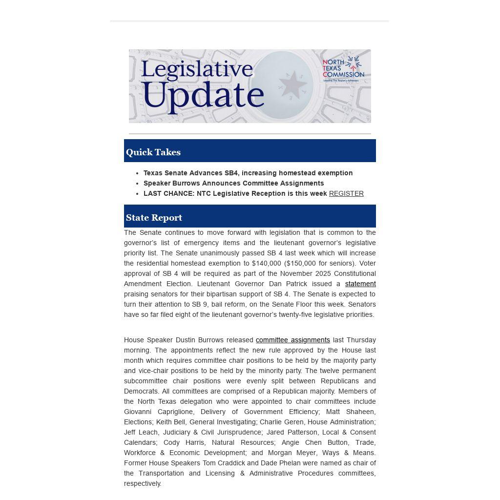 The Senate continues to move forward with legislation that is common to the governor’s list of emergency items and the lieutenant governor’s legislative priority list. The Senate unanimously passed SB 4 last week which will increase the residential homestead exemption to $140,000 ($150,000 for seniors). Voter approval of SB 4 will be required as part of the November 2025 Constitutional Amendment Election. Lieutenant Governor Dan Patrick issued a statement praising senators for their bipartisan support of SB 4. The Senate is expected to turn their attention to SB 9, bail reform, on the Senate Floor this week. Senators have so far filed eight of the lieutenant governor’s twenty-five legislative priorities.