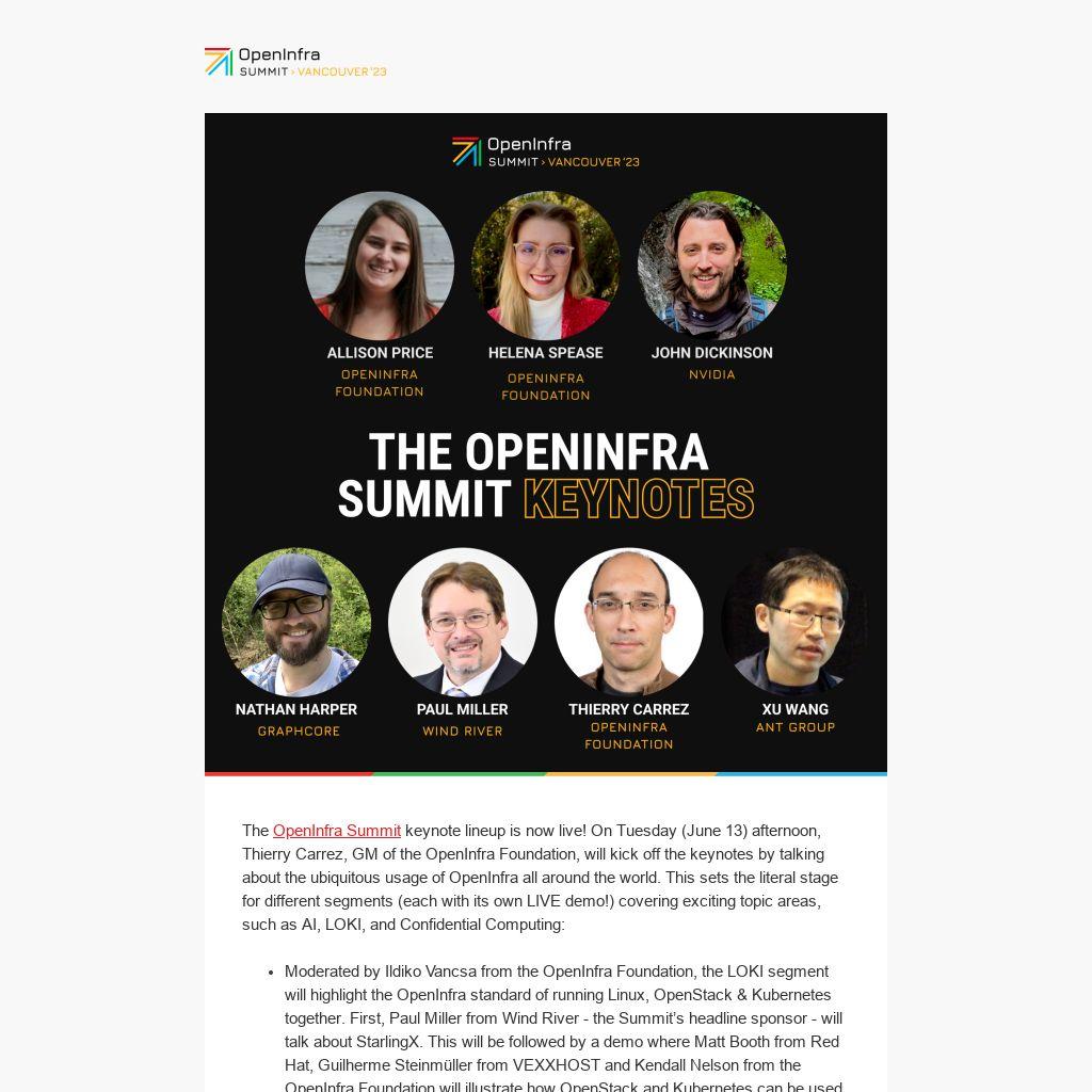 The OpenInfra Summit keynote lineup is now live! On Tuesday (June 13) afternoon, Thierry Carrez, GM of the OpenInfra Foundation, will kick off the keynotes by talking about the ubiquitous usage of OpenInfra all around the world. This sets the literal stage for different segments (each with its own LIVE demo!) covering exciting topic areas, such as AI, LOKI, and Confidential Computing: