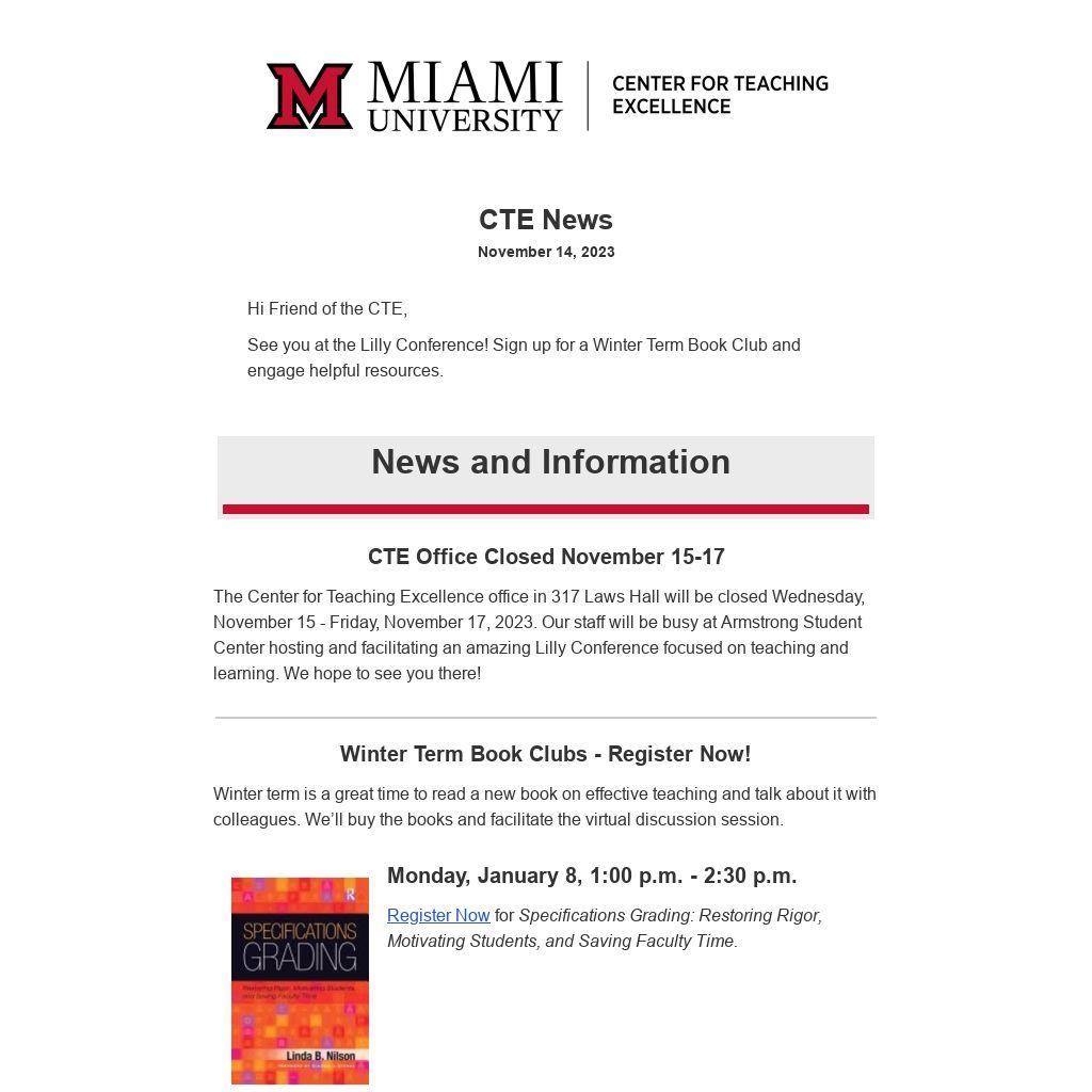 The Center for Teaching Excellence office in 317 Laws Hall will be closed Wednesday, November 15 - Friday, November 17, 2023. Our staff will be busy at Armstrong Student Center hosting and facilitating an amazing Lilly Conference focused on teaching and learning. We hope to see you there!