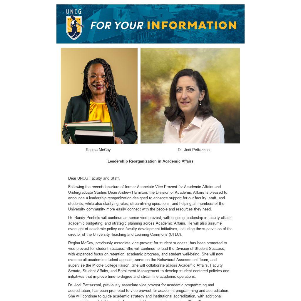 Regina McCoy, previously associate vice provost for student success, has been promoted to vice provost for student success. She will continue to lead the Division of Student Success, with expanded focus on retention, academic progress, and student well-being. She will now oversee all academic student appeals, serve on the Behavioral Assessment Team, and supervise the Middle College liaison. She will collaborate across Academic Affairs, Faculty Senate, Student Affairs, and Enrollment Management to develop student-centered policies and initiatives that improve time-to-degree and streamline academic operations.