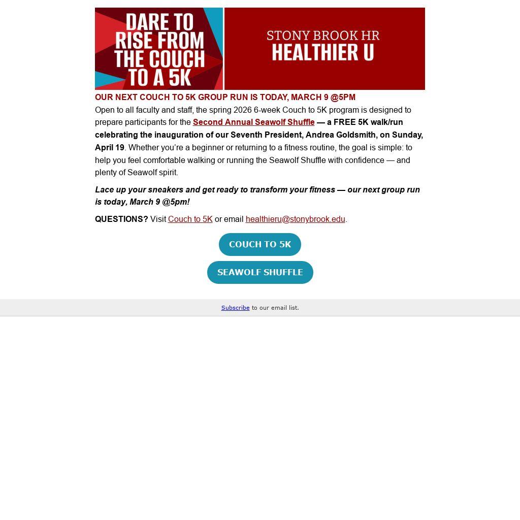 Open to all faculty and staff, the spring 2026 6-week Couch to 5K program is designed to prepare participants for the Second Annual Seawolf Shuffle — a FREE 5K walk/run celebrating the inauguration of our Seventh President, Andrea Goldsmith, on Sunday, April 19. Whether you’re a beginner or returning to a fitness routine, the goal is simple: to help you feel comfortable walking or running the Seawolf Shuffle with confidence — and plenty of Seawolf spirit.