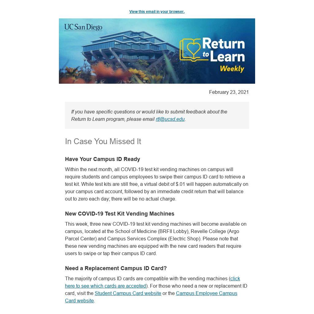 Answer: All UC San Diego staff, faculty and student employees who are reporting to campus or any other physical UC San Diego location for work must continue to conduct a daily symptom and exposure screening for COVID-19 and report any symptoms after vaccination. Learn more on the