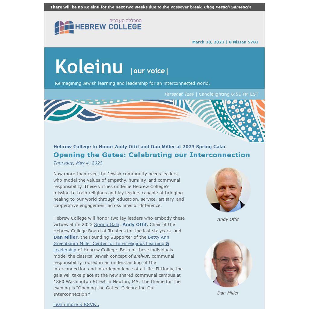 Hebrew College to Honor Andy Offit and Dan Miller at 2023 Spring Gala: