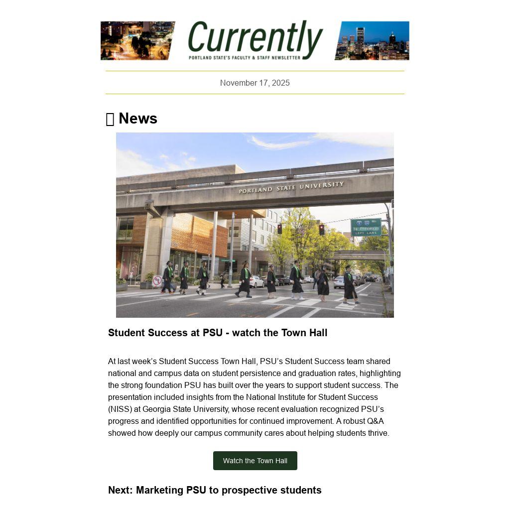 CURRENTLY is a weekly newsletter for the employees of Portland State University, published by University Communications. News items, events and accolades should be sent to currently@pdx.edu. Deadline is noon, the Tuesday before publication. See the Currently website for submission guidelines and schedule.