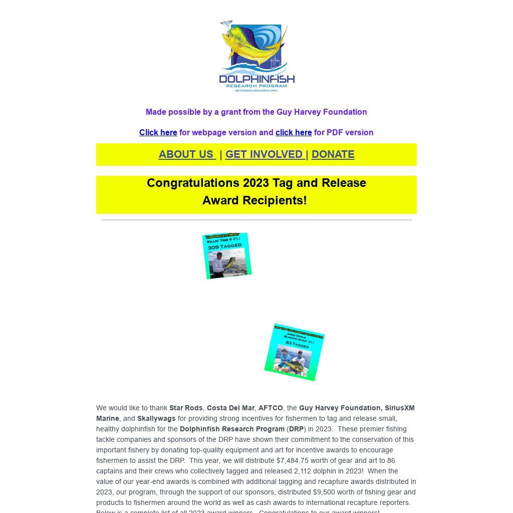 We would like to thank Star Rods, Costa Del Mar, AFTCO, the Guy Harvey Foundation, SiriusXM Marine, and Skallywags for providing strong incentives for fishermen to tag and release small, healthy dolphinfish for the Dolphinfish Research Program (DRP) in 2023. These premier fishing tackle companies and sponsors of the DRP have shown their commitment to the conservation of this important fishery by donating top-quality equipment and art for incentive awards to encourage fishermen to assist the DRP. This year, we will distribute $7,484.75 worth of gear and art to 86 captains and their crews who collectively tagged and released 2,112 dolphin in 2023! When the value of our year-end awards is combined with additional tagging and recapture awards distributed in 2023, our program, through the support of our sponsors, distributed $9,500 worth of fishing gear and products to fishermen around the world as well as cash awards to international recapture reporters. Below is a complete list of all 2023 award winners. Congratulations to our award winners!