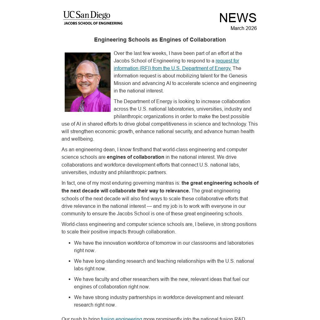fusion engineering more prominently into the national fusion R&D landscape is one example of how the Jacobs School, and UC San Diego overall, are collaborating with multiple national labs, established companies and startups, as well as other universities and philanthropic partners to scale our positive impacts in the national interest.