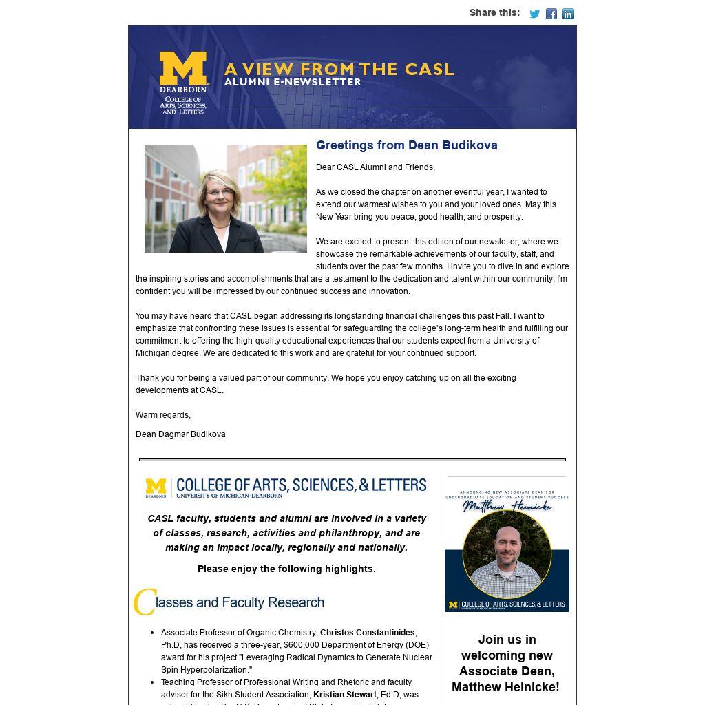 You may have heard that CASL began addressing its longstanding financial challenges this past Fall. I want to emphasize that confronting these issues is essential for safeguarding the college’s long-term health and fulfilling our commitment to offering the high-quality educational experiences that our students expect from a University of Michigan degree. We are dedicated to this work and are grateful for your continued support.