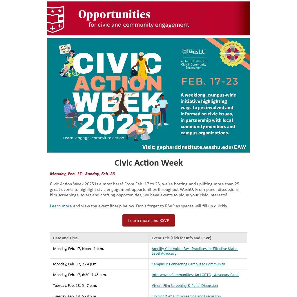 Civic Action Week 2025 is almost here! From Feb. 17 to 23, we're hosting and uplifting more than 25 great events to highlight civic engagement opportunities throughout WashU. From panel discussions, film screenings, to art and crafting opportunities, we have events to pique your civic interests!