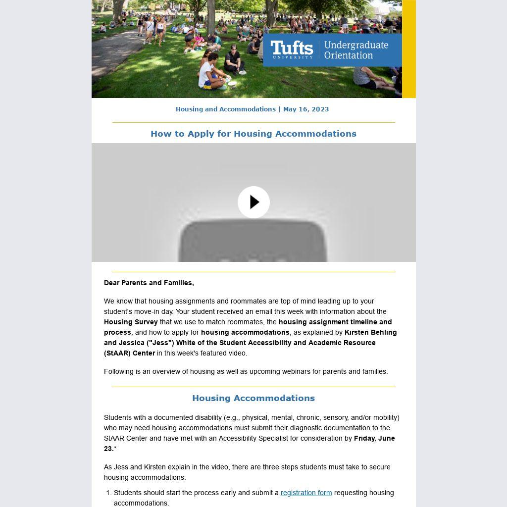 We know that housing assignments and roommates are top of mind leading up to your student's move-in day. Your student received an email this week with information about the Housing Survey that we use to match roommates, the housing assignment timeline and process, and how to apply for housing accommodations, as explained by Kirsten Behling and Jessica ("Jess") White of the Student Accessibility and Academic Resource (StAAR) Center in this week's featured video.