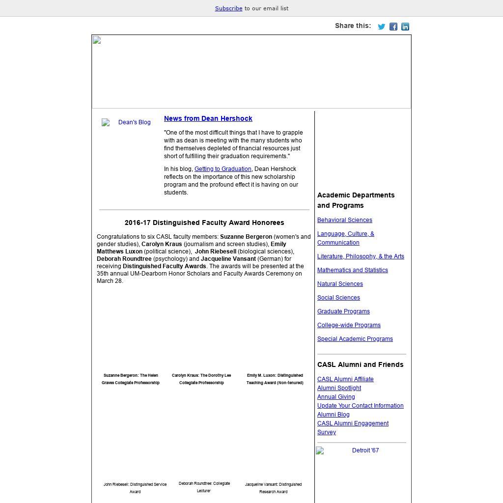 Congratulations to six CASL faculty members: Suzanne Bergeron (women's and gender studies), Carolyn Kraus (journalism and screen studies), Emily Matthews Luxon (political science), John Riebesell (biological sciences), Deborah Roundtree (psychology) and Jacqueline Vansant (German) for receiving Distinguished Faculty Awards. The awards will be presented at the 35th annual UM-Dearborn Honor Scholars and Faculty Awards Ceremony on March 28.