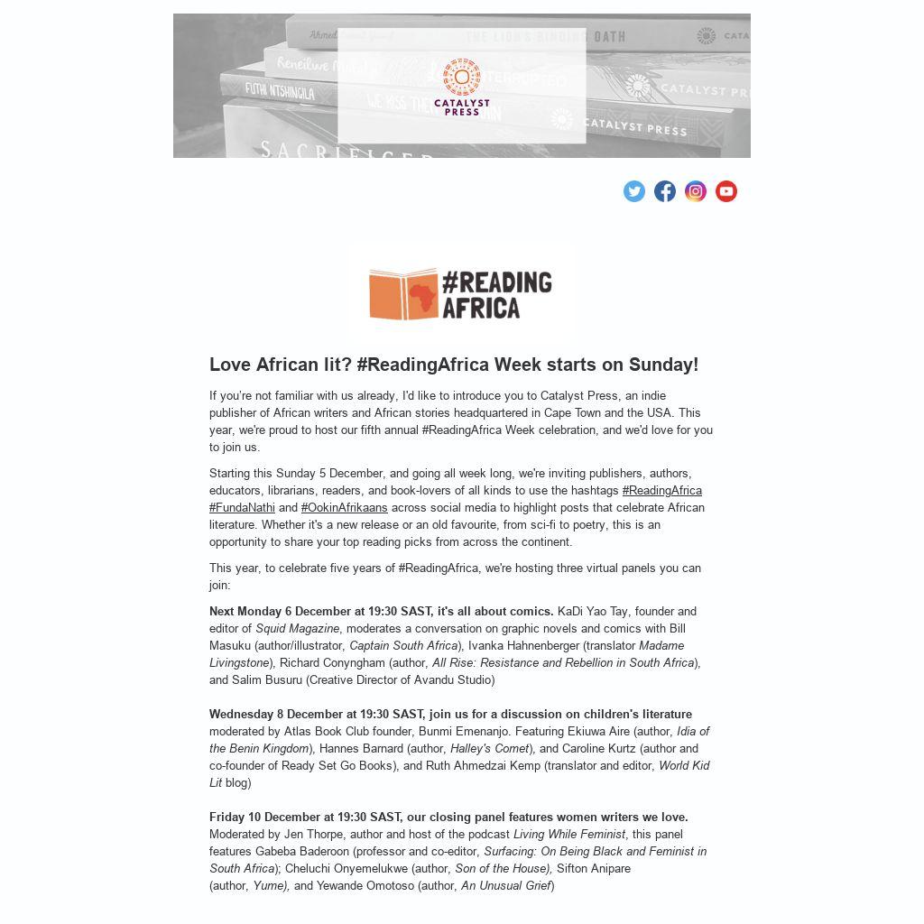 If you’re not familiar with us already, I'd like to introduce you to Catalyst Press, an indie publisher of African writers and African stories headquartered in Cape Town and the USA. This year, we're proud to host our fifth annual #ReadingAfrica Week celebration, and we'd love for you to join us.Â