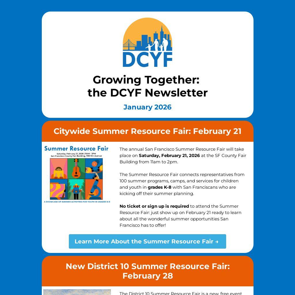 The District 10 Summer Resource Fair is a new, free event hosted by DCYF, the SF Public Utilities Commission, and the Southeast Community Facility Commission that will connect children, youth, and families who live in Bayview, Hunters Point, Visitacion Valley, Dogpatch, and other southeast San Francisco neighborhoods with summer programs and resources.