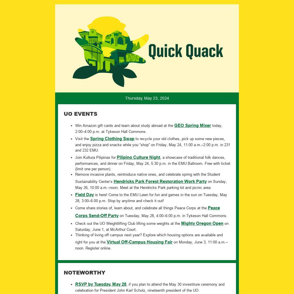 - Win Amazon gift cards and learn about study abroad at the GEO Spring Mixer today, 2:00–4:00 p.m. at Tykeson Hall Commons.