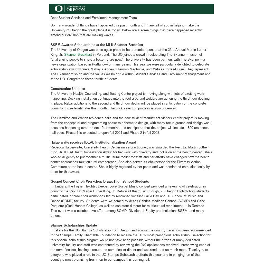So many wonderful things have happened this past month and I thank all of you in helping make the University of Oregon the great place it is today. Below are a some things that have happened recently among our division that are making waves.