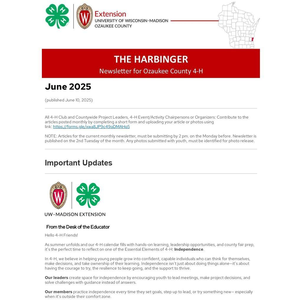 All 4-H Club and Countywide Project Leaders, 4-H Event/Activity Chairpersons or Organizers: Contribute to the articles posted monthly by completing a short form and uploading your article or photos using link: https://forms.gle/xwa8JP9c49qDMAHq5