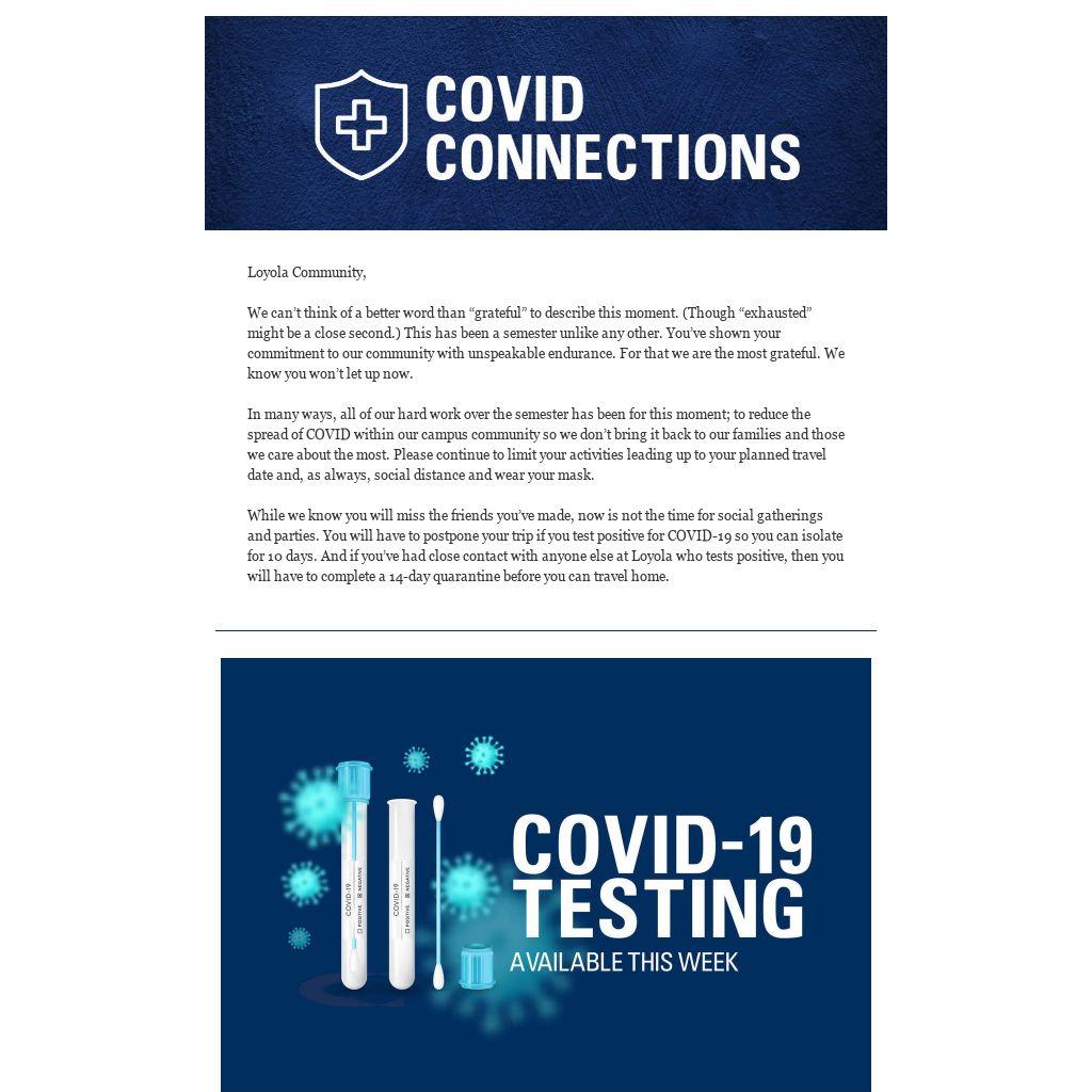 While we know you will miss the friends you’ve made, now is not the time for social gatherings and parties. You will have to postpone your trip if you test positive for COVID-19 so you can isolate for 10 days. And if you’ve had close contact with anyone else at Loyola who tests positive, then you will have to complete a 14-day quarantine before you can travel home.