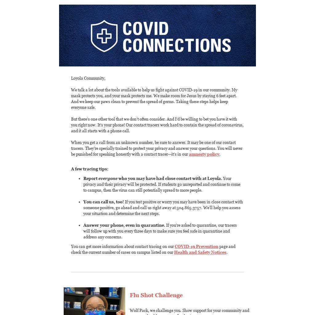 You can get your flu shot right here on campus during our Flu Shot Fair. Stop by the St. Charles Room in the Danna Student Center, available for walk-ins from 10 a.m. – 2 p.m. on these dates: