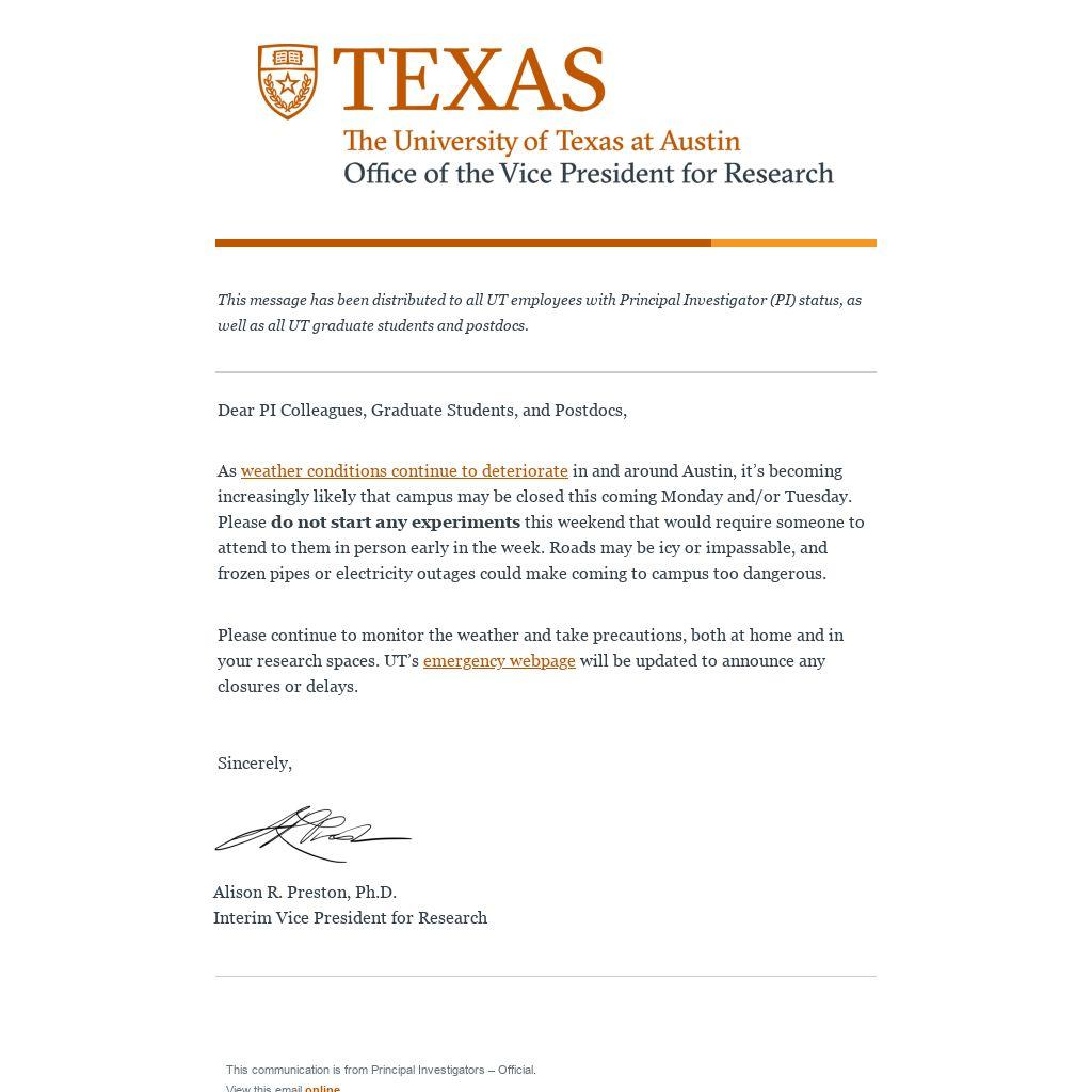 This message has been distributed to all UT employees with Principal Investigator (PI) status, as well as all UT graduate students and postdocs.