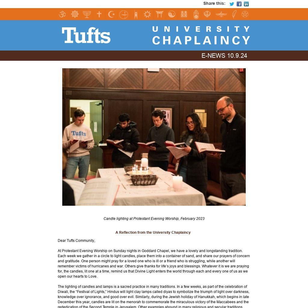 The University Chaplaincy is a dynamic hub supporting religious, spiritual, ethical, and cultural life for all members of the Tufts community. We provide spiritual care, support religious and philosophical communities, educate about spiritual and ethical issues in society and the world, and promote multifaith engagement.