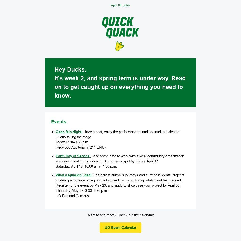 What a Quackin’ Idea!: Learn from alumni’s journeys and current students’ projects while enjoying an evening on the Portland campus. Transportation will be provided. Register for the event by May 20, and apply to showcase your project by April 30.