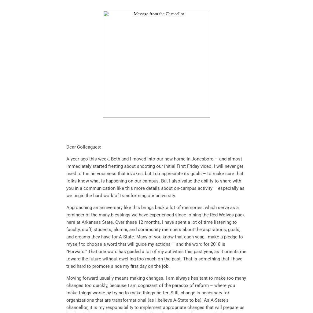 Approaching an anniversary like this brings back a lot of memories, which serve as a reminder of the many blessings we have experienced since joining the Red Wolves pack here at Arkansas State. Over these 12 months, I have spent a lot of time listening to faculty, staff, students, alumni, and community members about the aspirations, goals, and dreams they have for A-State. Many of you know that each year, I make a pledge to myself to choose a word that will guide my actions – and the word for 2018 is "Forward." That one word has guided a lot of my activities this past year, as it orients me toward the future without dwelling too much on the past. That is something that I have tried hard to promote since my first day on the job.