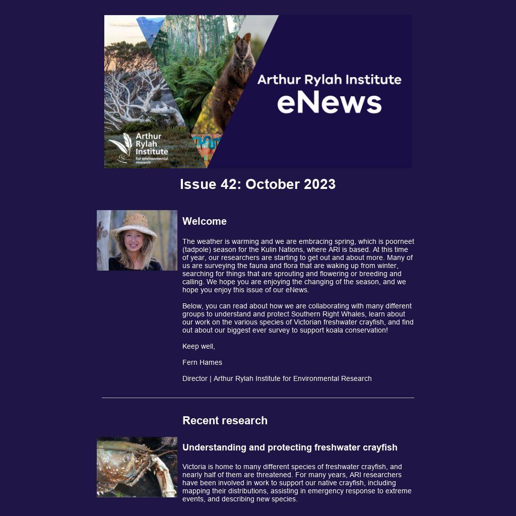 The weather is warming and we are embracing spring, which is poorneet (tadpole) season for the Kulin Nations, where ARI is based. At this time of year, our researchers are starting to get out and about more. Many of us are surveying the fauna and flora that are waking up from winter, searching for things that are sprouting and flowering or breeding and calling. We hope you are enjoying the changing of the season, and we hope you enjoy this issue of our eNews.