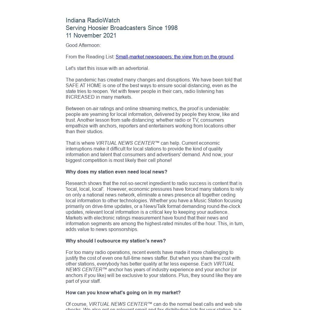 Indiana RadioWatch subscriptions are free. To subscribe, send an e-mail to irw@well.com and we'll add you. After publication, we archive Indiana RadioWatch on the Indiana Radio Archive at indianaradio.net. Please e-mail us your news stories and employment opportunities.
