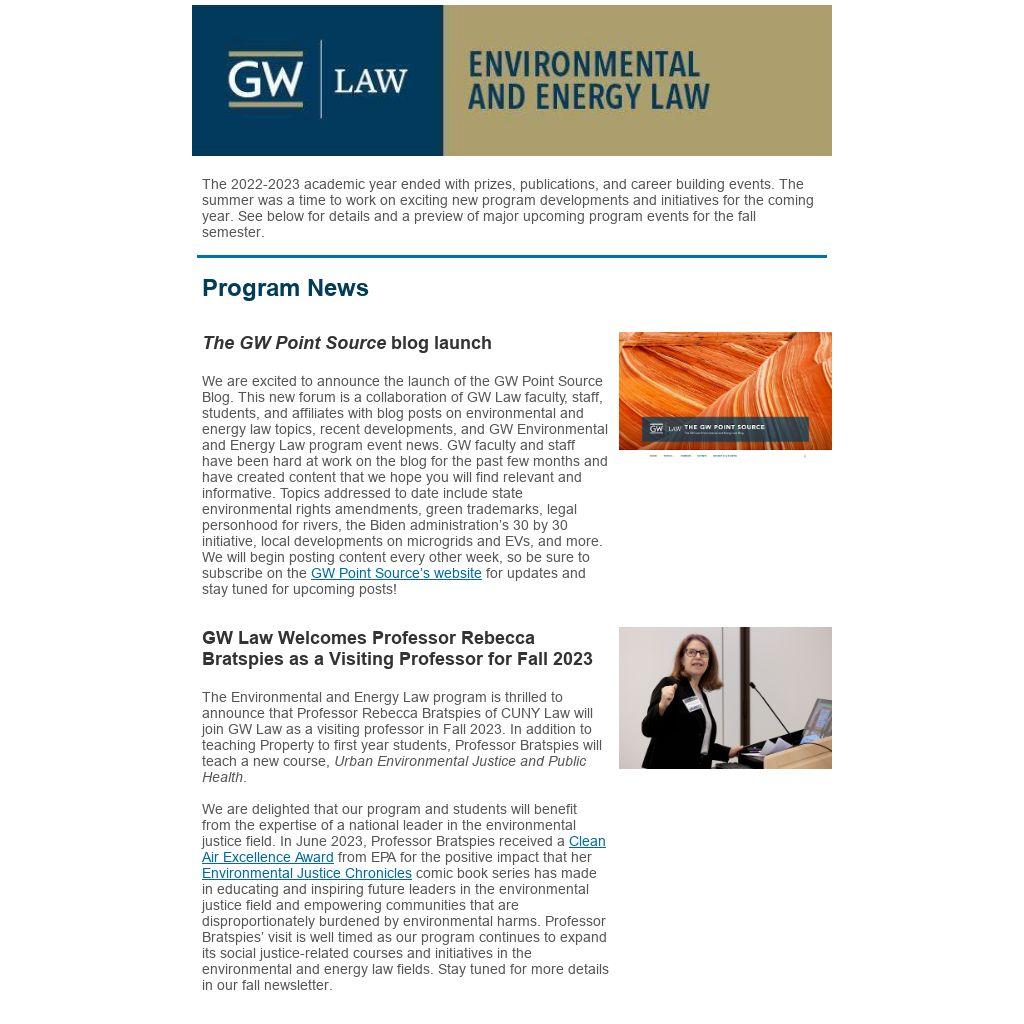 We are excited to announce the launch of the GW Point Source Blog. This new forum is a collaboration of GW Law faculty, staff, students, and affiliates with blog posts on environmental and energy law topics, recent developments, and GW Environmental and Energy Law program event news. GW faculty and staff have been hard at work on the blog for the past few months and have created content that we hope you will find relevant and informative. Topics addressed to date include state environmental rights amendments, green trademarks, legal personhood for rivers, the Biden administration’s 30 by 30 initiative, local developments on microgrids and EVs, and more. We will begin posting content every other week, so be sure to subscribe on the GW Point Source’s website for updates and stay tuned for upcoming posts!