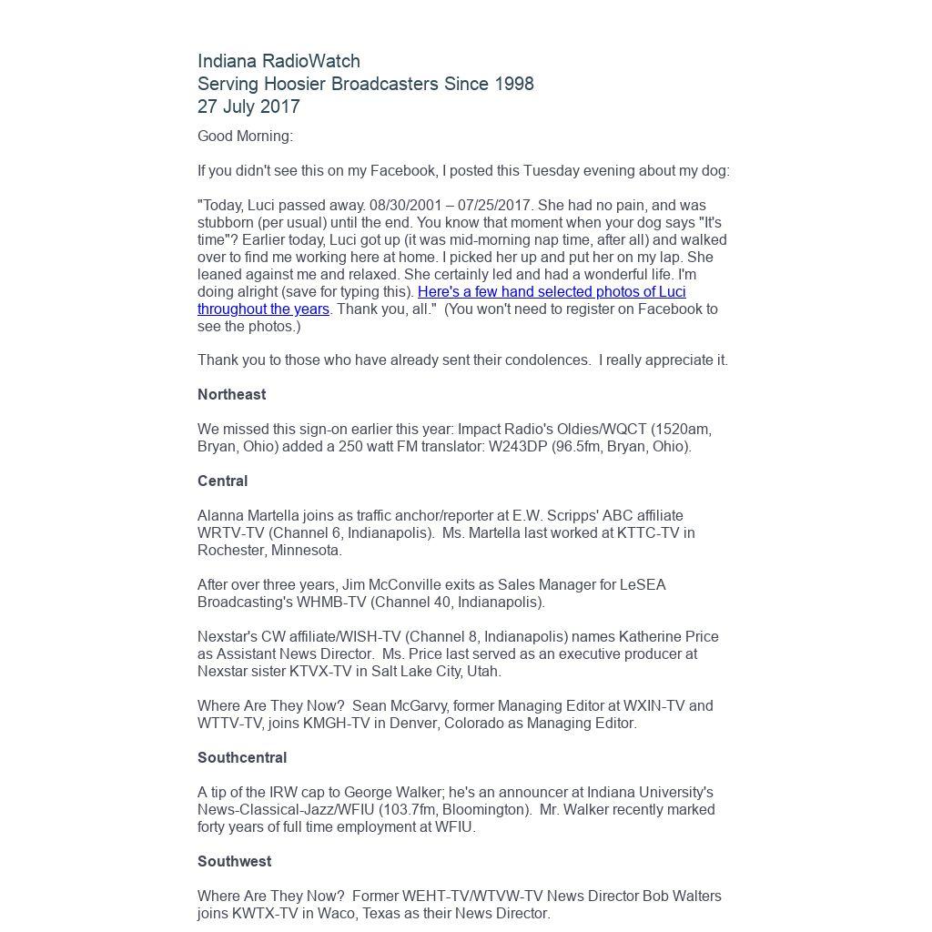 Indiana RadioWatch subscriptions are free. To subscribe, send an e-mail to irw@well.com and we'll add you. After publication, we archive Indiana RadioWatch on the Indiana Radio Archive at http://www.indianaradio.net. Please e-mail us your news stories and employment opportunities.