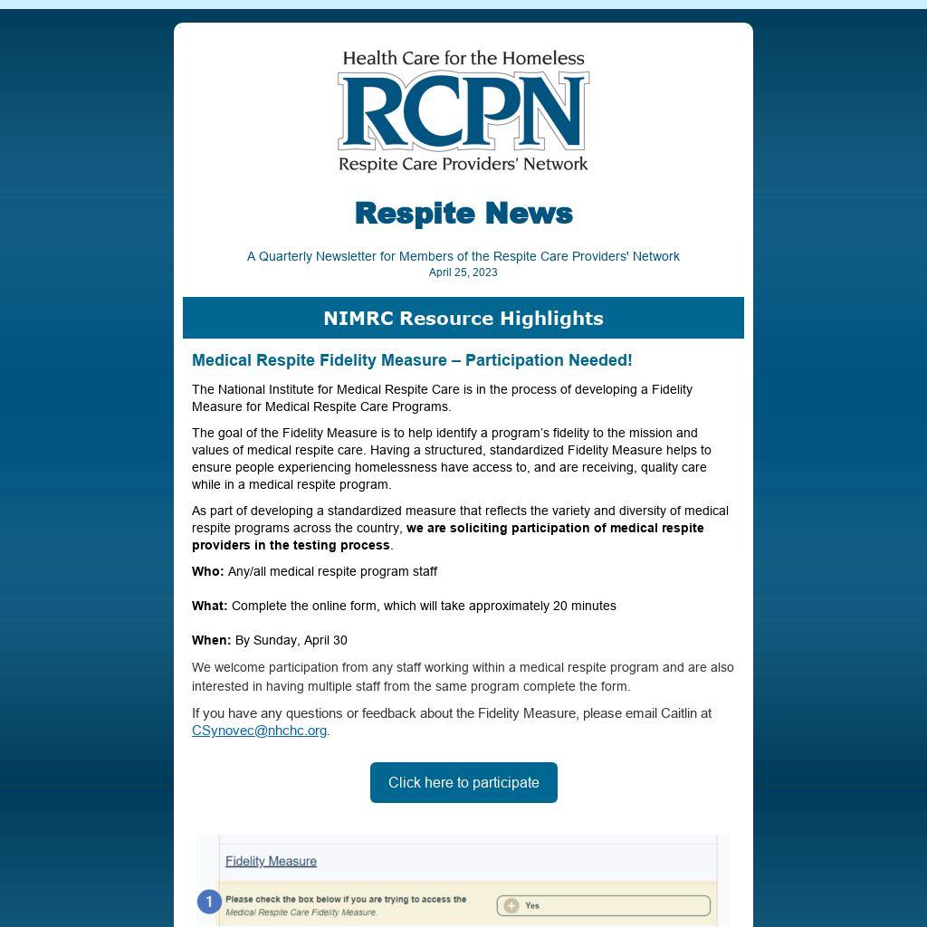 - If you are not already a member, please join the Respite Care Providers Network (RCPN). The mission of RCPN is to improve the health status of individuals who are homeless by supporting programs that provide medical respite and related services. Follow this link for more information and to join the RCPN.