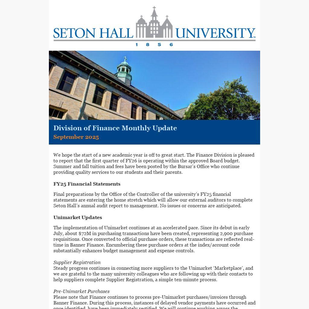 The Fall 2025 Division of Finance Open Forum on the South Orange campus will be held in the Bishop Dougherty University Center, Chancellor’s Suite, on October 14, 3-4 p.m. Register here.