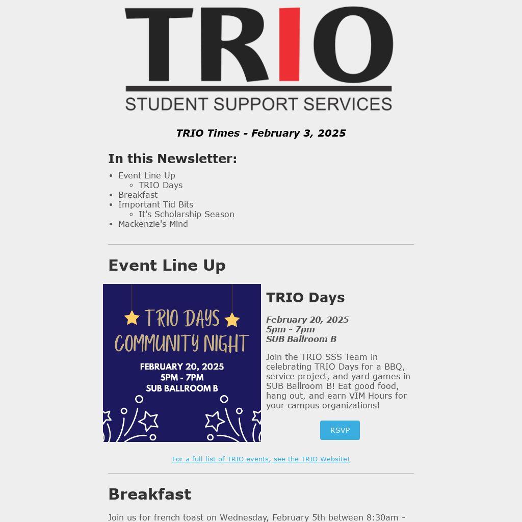 Join us for french toast on Wednesday, February 5th between 8:30am - 11:00am in the TRIO Office!